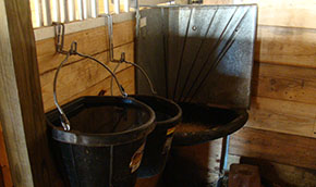 Each stall has a hay and feed bin and ample clean water. All stalls are rubber matted with yellow pine wood shaved bedding.