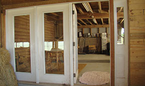 The stalls are located in the renovated downstairs of a large bank barn. The floor was actually lowered to accommodate its 8’ clearance. Two stalls are specifically designed to serve the needs of horses who, for medical or emotional reasons, need to be away from the main action but close enough to hear they are not alone. Because the stalls are underground, they stay cooler in the summer and warmer in the winter. The stables' location is blessed with natural soft breezes providing ventilation through the stable area. In winter, large side panels are closed off to reduce winter’s chill. The entire interior stable floor is rubber matted. The stables also have a grain room that also serves as the kitty cuddle corner.