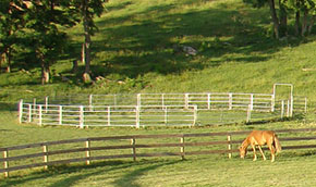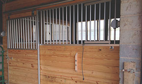 Stall sizes range from 9'x12' to 14'x12'. Each stall is unique: some with removable walls, walk through doors or double entrances. Each stall is constructed of 2"x6" tongue -n - groove yellow pine and have been sealed for ease of cleaning and disinfection. Each stall has an individual light, a power source, feeding/hay bin, water bucket (heated in winter) and a fan in summer. Each has an easy-glide sliding door with no dangerous latches or protrusions. The entire upper portion of each stall is constructed of metal grills and an open/close window to maximize ventilation and maintain safety while not loosing contact or communication with buddies.